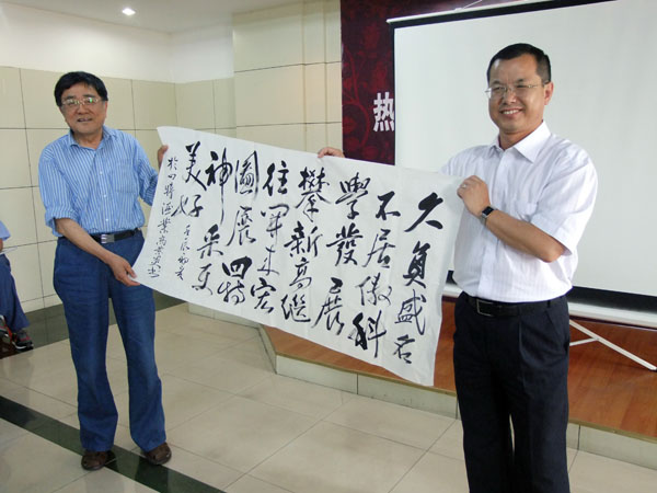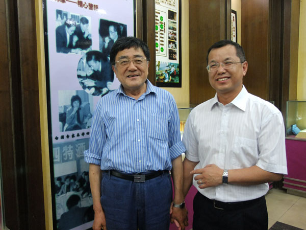 隨后,高景炎一行在公司含弘樓8樓會議室召開了座談會,會上,我司吳生文副總及北京牛欄山酒廠負責人就兩司生產經營及產品推廣等方面的情況做了意見交流。高老先生也對四特古法工藝給予新意新解,并鼓勵北京牛欄山酒廠以發展迅猛的四特為榜樣,將其先進的管理發展理念帶回牛欄山深入學習和發揚。最后,高老先生指出四特酒擁有著60年特香型工藝的深厚積淀,相信四特酒公司發展的新紀元即將到來。他興致所至,臨時提筆賦詞一首贈予四特酒:“久負盛名不倨傲,科學發展攀新高;繼往開來宏圖展,四特神采更美好?!彼奶鼐乒疽矊罹珗D治,戒驕戒躁,早日躋身全國白酒行業第一方陣,努力實現高老先生的美好祝愿,展宏圖,攀新高。